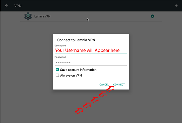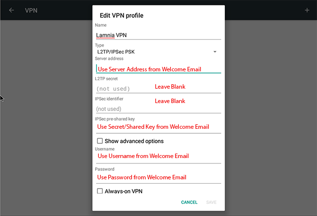 In the Name type in Lamnia VPN ( If adding multiple VPN connections describe accordingly ) Once you sign up we send you a Welcome Email, within this you will find all the details you need: List of Servers, Secret/Shared Key and Username & Password TYPE IN CAREFULLY they are case sensitive Once completed tap SAVE |