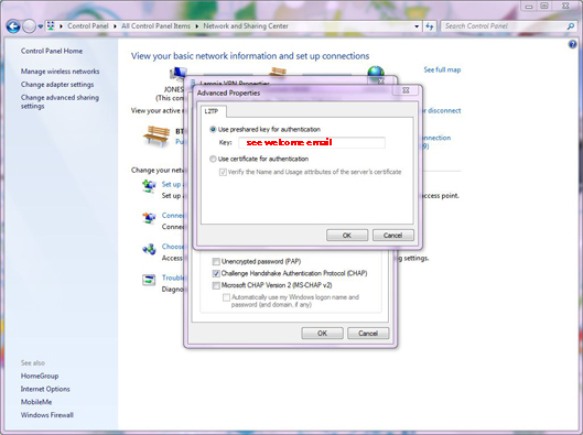 In the “IPsec Settings” dialog, click the radio button labeled “Use preshared key for authentication”. Then type ‘the shared key from the welcome email’ into the textbox labeled “Key”. Then click the “OK” button. |
