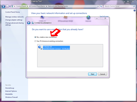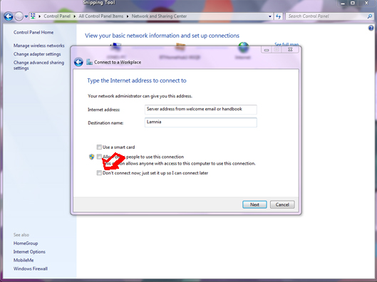 In the text box labeled ‘Destination name’ type ‘Lamnia’. This is the name of the connection, and will show up in the “Connect to a network” screen when we’re done.