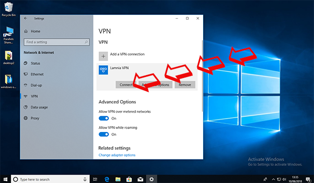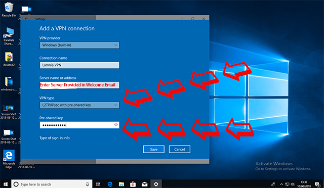 When you sign up we send you all the details required below in a Welcome Email. Type them carefully as they are CASE sensitive As VPN provider, select : Windows (built in ) Connection name : lamnia VPN Server name or address : We send you this in the Welcome Email VPN type : L2TP/IPSec with pre-shared key Then Scroll down. |